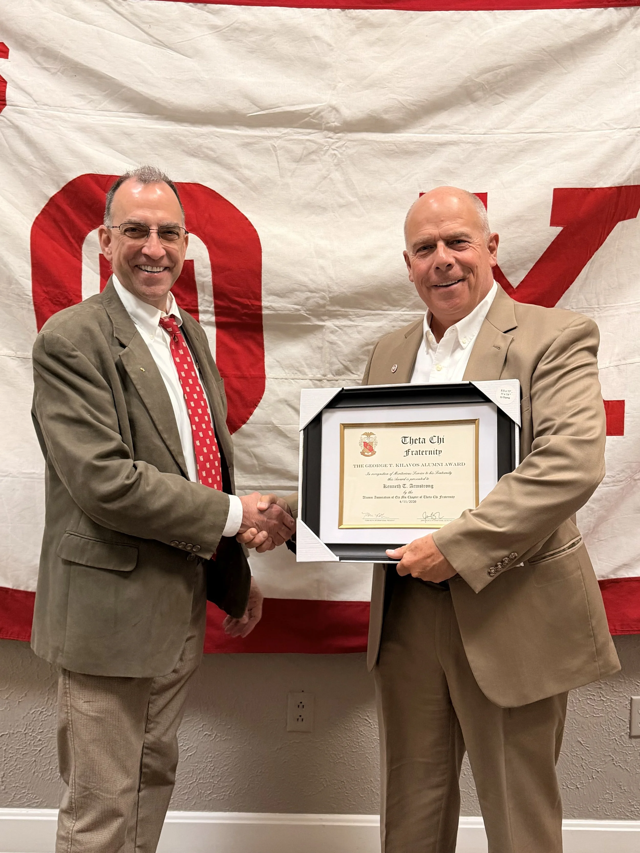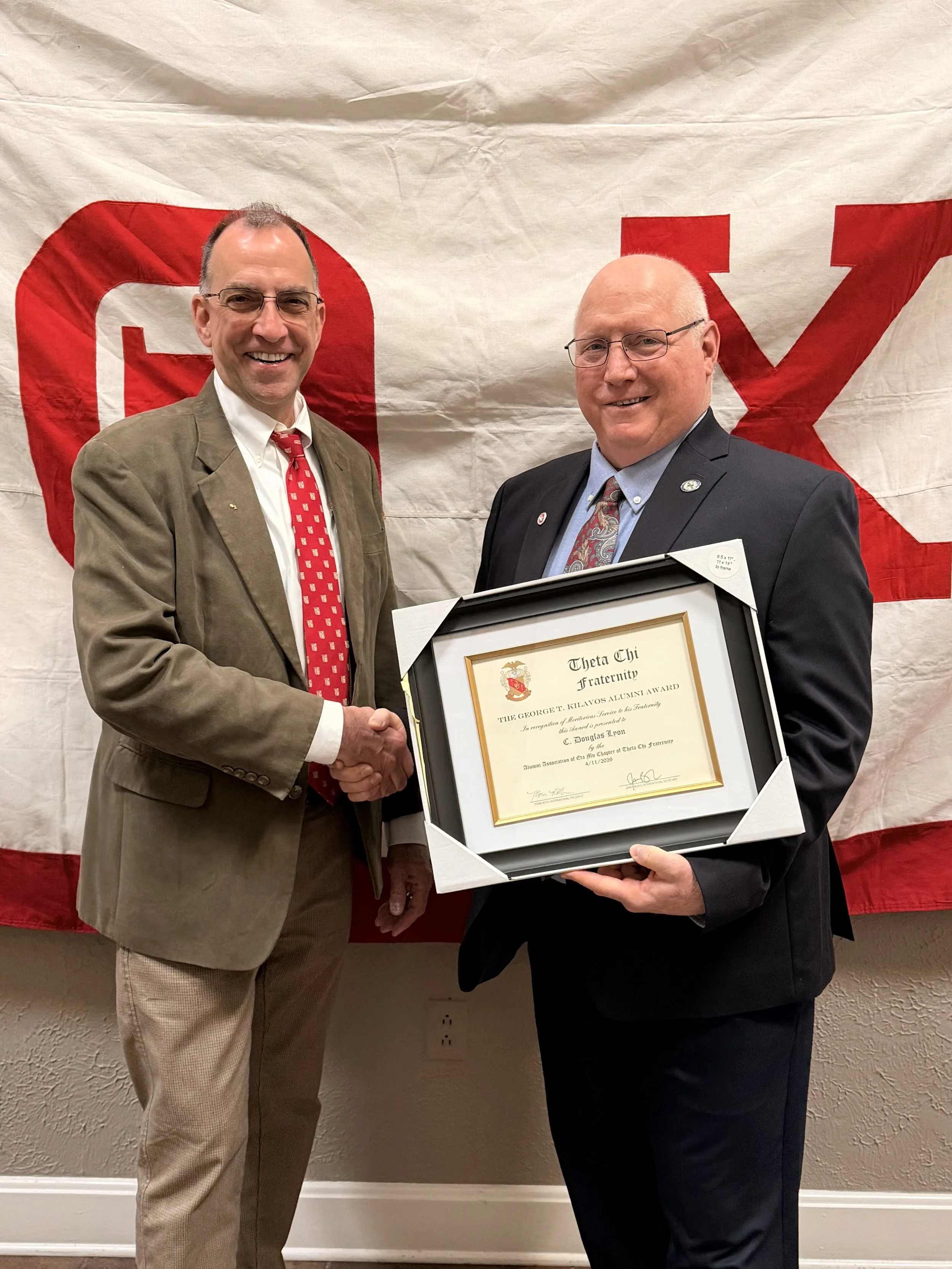 George T. Kilavos Alumni Award - made to those who, by reason of exceptional service, personal effort, and unselfish interest, have made meritorious contributions to the local, regional, or national general welfare of Theta Chi Fraternity. This years recipients are Kenneth T. Armstrong and C. Douglas Lyon.