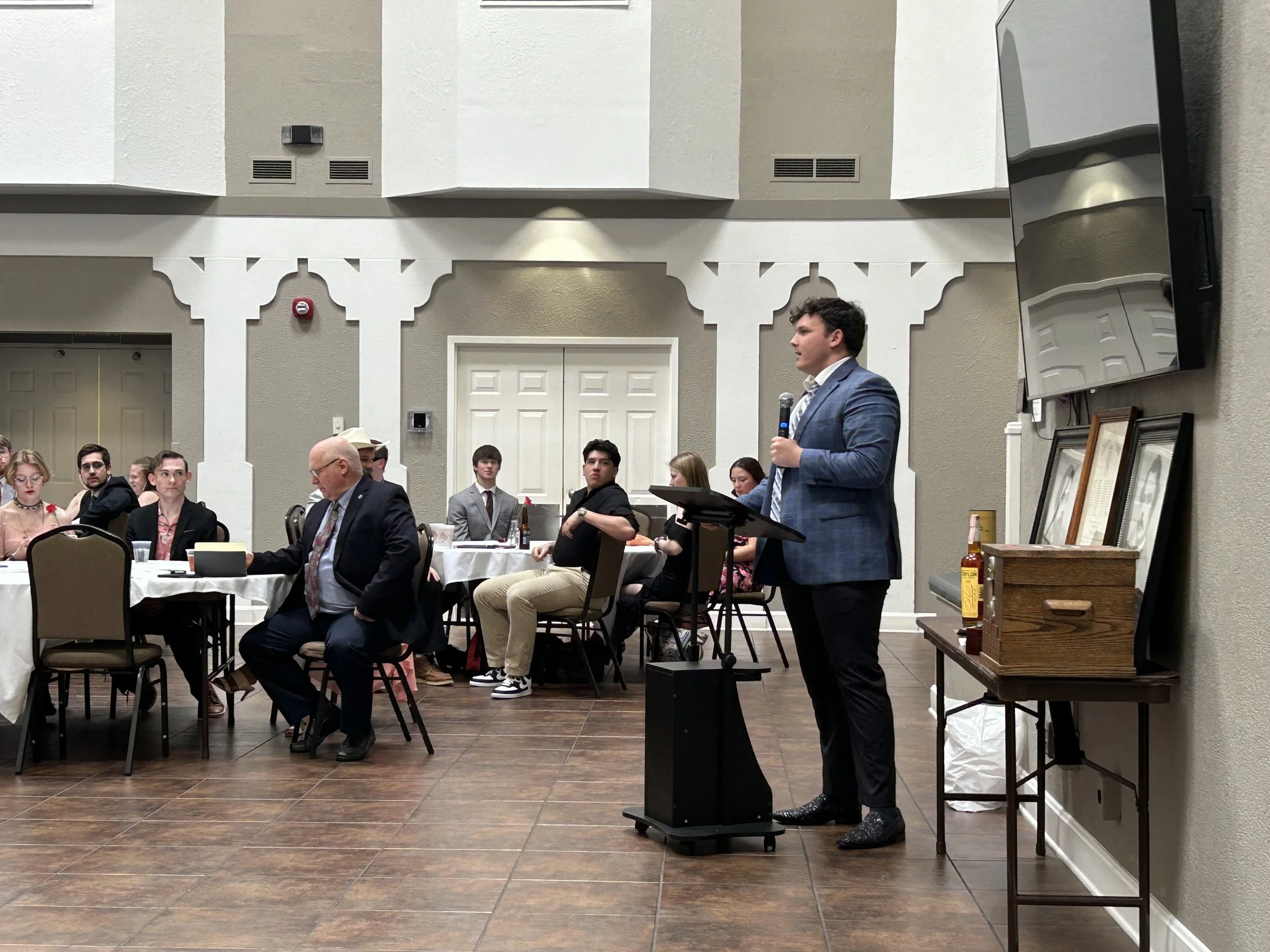 Then the formal event itself occurred on Saturday evening. The event started with opening remarks from the President of the Alumni Association, Che Brindle and the President of the Collegiate Chapter, Cooper Sterling. The welcoming remarks indicated a welcome to all in attendance and recognition that our chapter is thriving and celebrating the time together as a brotherhood. This led to a formal dinner including great music, alumni catch up discussions, and new introductions of brothers across the alumni and collegiates in attendance.